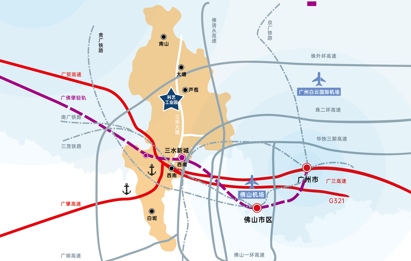 三水地处粤港澳大湾区的黄金区位,拥有发达的水、陆、空、铁、港立体交通网络,毗邻珠江三角洲大中城市群及港澳地区。三水区距广州35km、深圳200km、香港230km、澳门195km,拥有融入2小时触达粤港优质经济圈的区位优势。